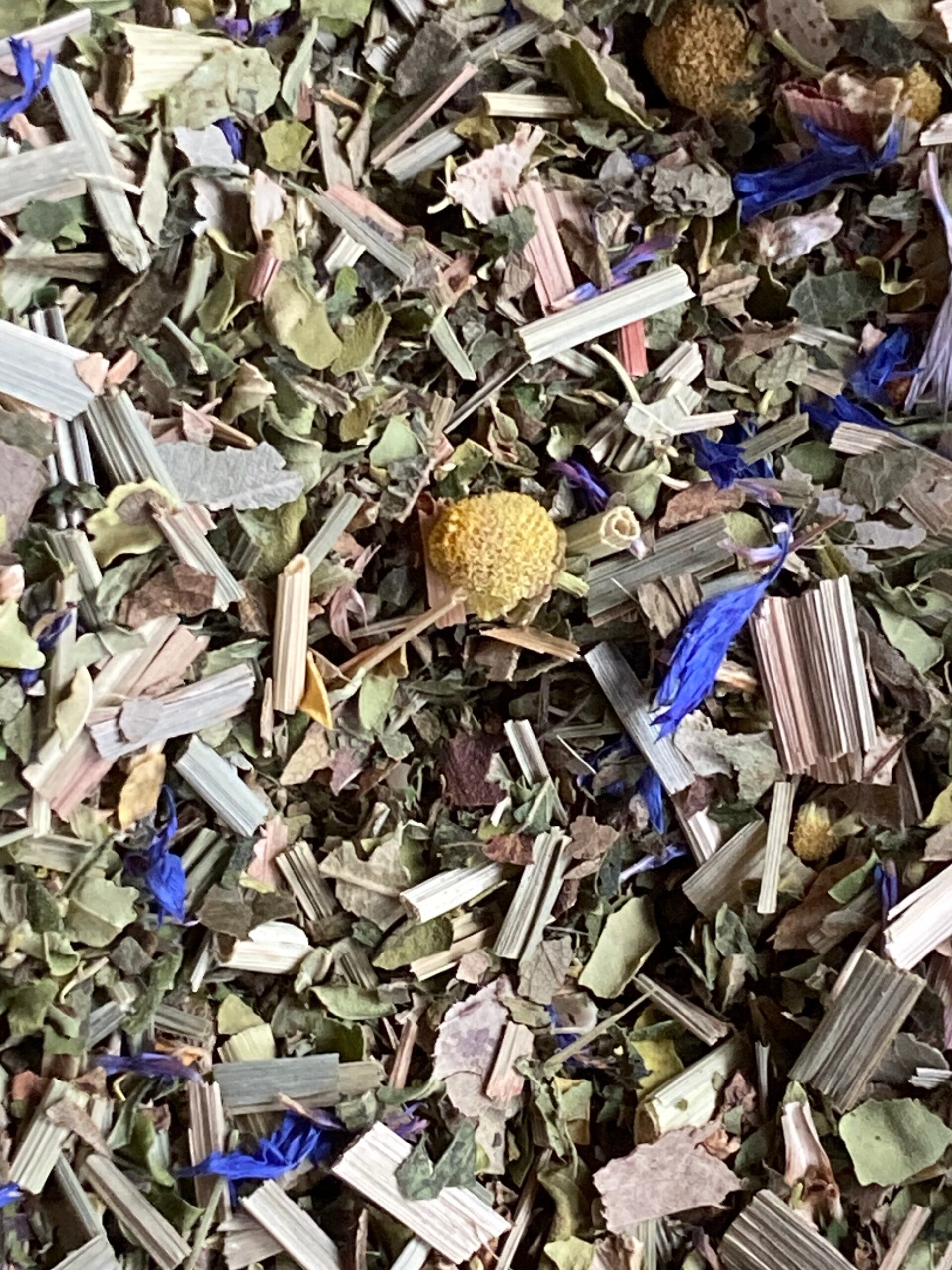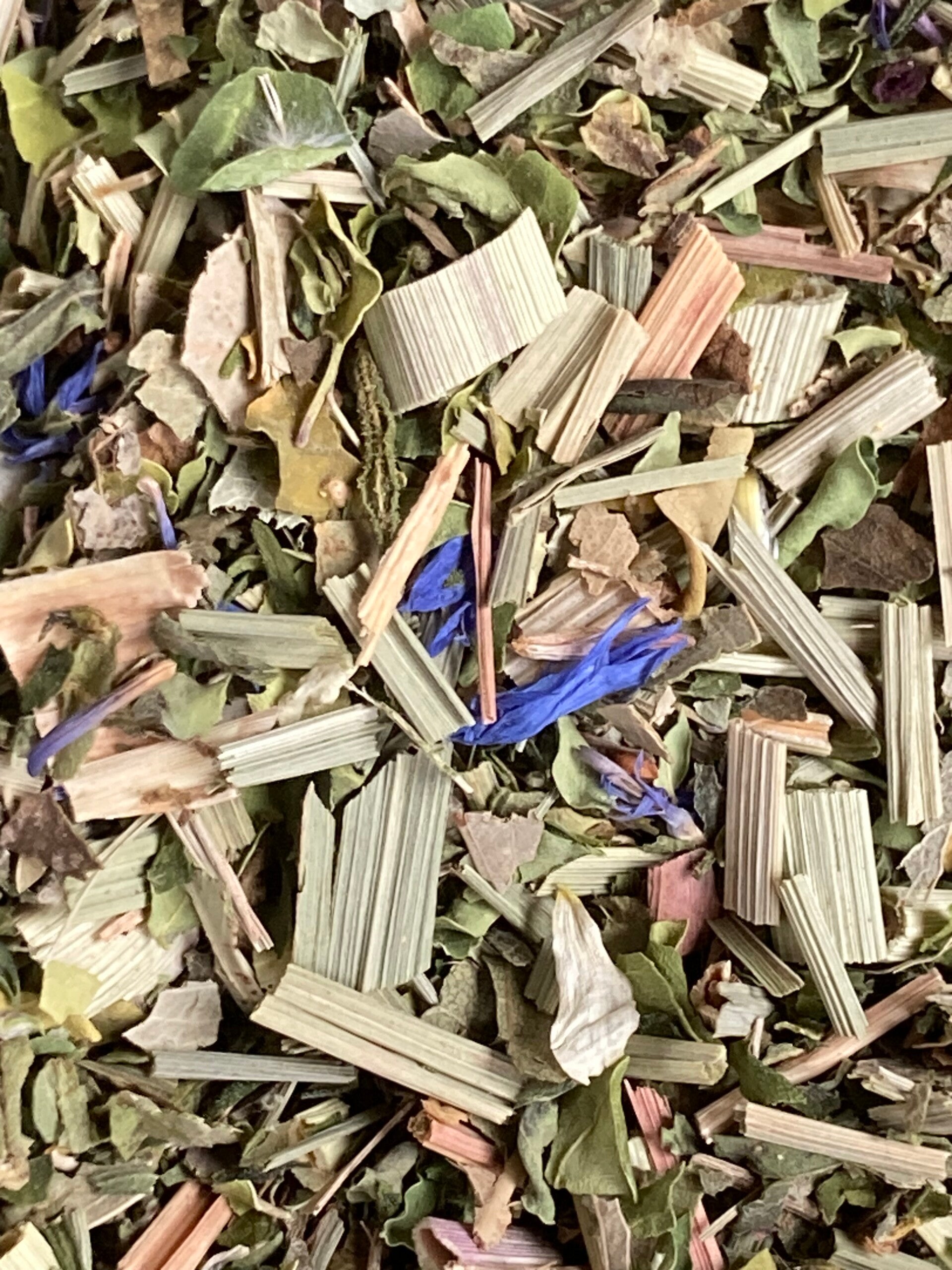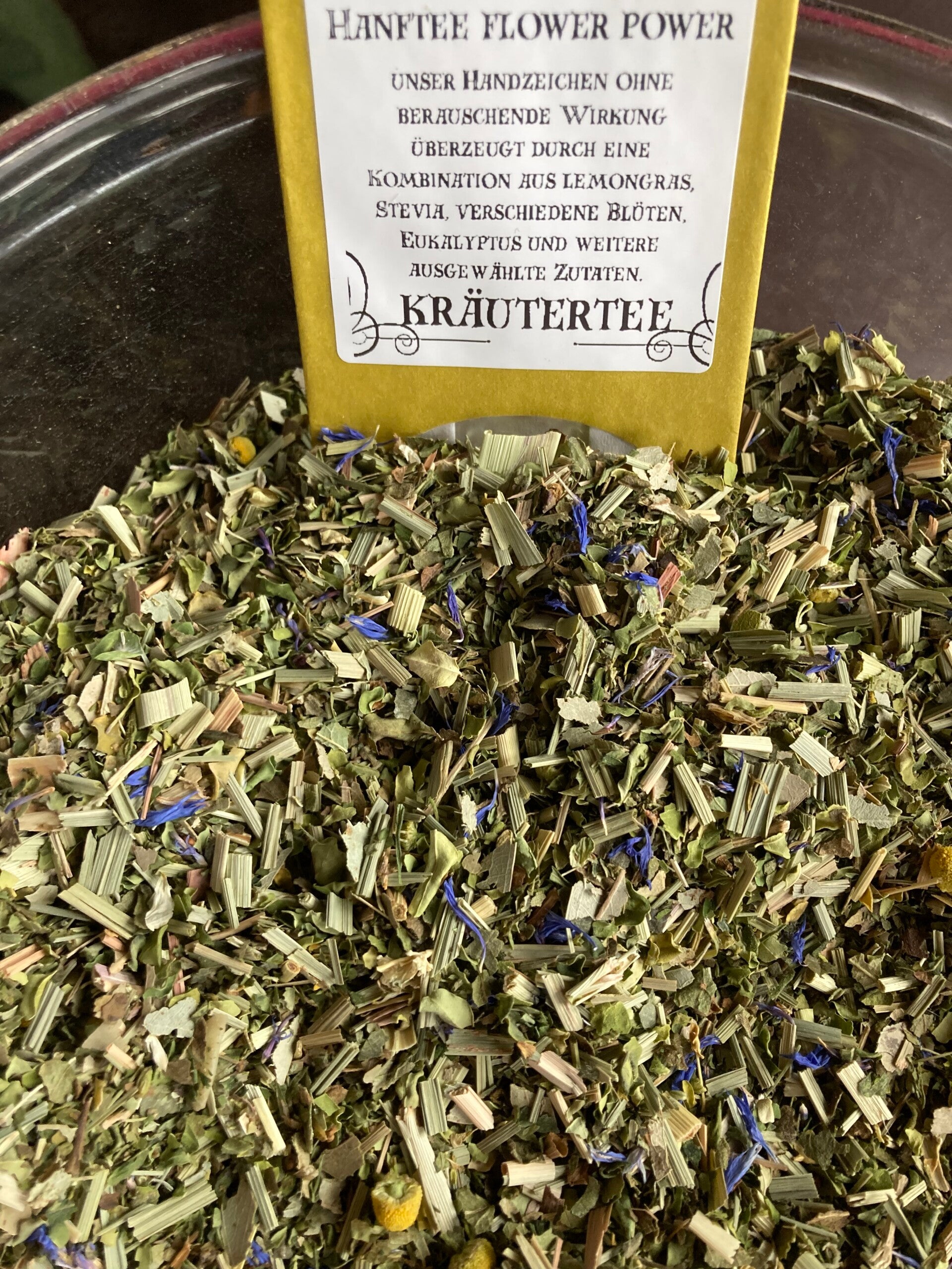 Zutaten: Lemongras, Moringa, Erdbeerblätter, Hanfblätter (10%), Eukalyptusblätter, MANDELhobel, Kornblumenblüten, Basilikum, Kamillenblüten, Steviablätter